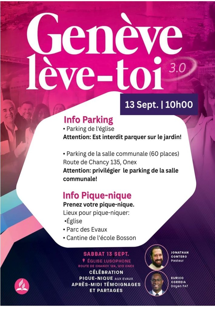 10h00 Partage avec Jonathan Contero | 11h00 Prédication d’Eurico Correia | 15h00 Partages et Louanges | Toutes les églises de Genève ont RDVS à Onex pour la journée.